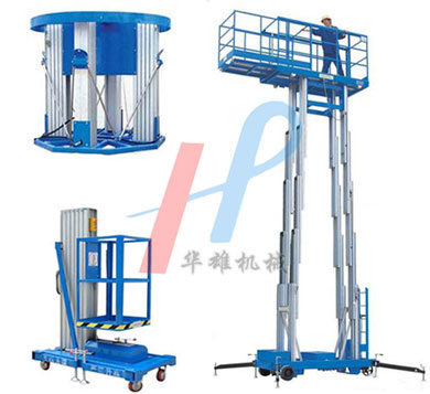 單桅鋁合金升降機是由單桅柱支撐作業(yè)平臺,是起初出現的鋁合金升降機。具有升降平衡,操作方便等優(yōu)點能,可隨意進出電梯且耗電少、無污染、工作時不傷 地面,可用于貼墻工作及探出作業(yè),工作無死角等優(yōu)點。雙桅鋁合金升降機整體采用高強度鋁型材精制而成由于型材強度高,使升降臺的偏轉與擺動極小。采用雙桅柱式結構,載重量大,平臺面積大,穩(wěn)定性極好,運轉靈活,推行方便。 三桅鋁合金升降機由三組桅柱支撐作業(yè)平臺同步升降,支腿結構同單桅柱式平臺,具有超大的載重量和優(yōu)秀的工作穩(wěn)定性。四桅鋁合金升降機整體采用高強度鋁型材精制而成由于型材強度高,采用四桅柱式結構,穩(wěn)定性極好,運轉靈活,載重量大,平臺面積大,推行更方便。